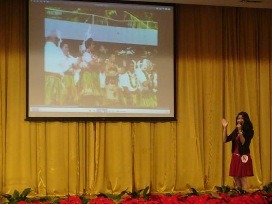 在第一轮“海岛风光”的模拟导游比赛中,张郑锦程选择了“汤加亲子游”进行展示。通过哆啦A梦的时光穿梭机,她带领游客欣赏了汤加美丽的风景,“早起的鸟儿有虫吃,早起的旅客朋友们有地道的汤加日出可以看。”欣赏美景的同时,她呼吁游客们行动起来,从个人做起,保护环境,为汤加永驻美丽容颜而努力。