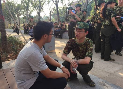 新生艰苦训练的同时,大二、大三的学长学姐们也贡献出自己的力量。军训期间,助班们无微不至的陪伴让同学与他们之间互相信赖,关系更加亲密。他们不仅陪伴新生进行军训,也毫无保留地和他们分享自己的大学生活经验,让他们能够尽快融入到集体中去。“希望他们不要忘记军训生活带给他们的感动。”心理162班的助班陈骁说。