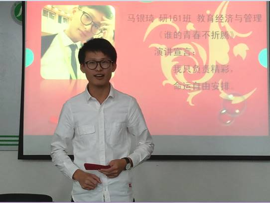 本次参赛选手中不乏小有成就之人,研161班的马银琦同学就是其中之一。他戏称自己为“折腾青年”,却在“折腾”中取得了不少成绩——无论是在学术上,还是在生活中,他都收获了自己应有的回报。他的丰富经历与激情演说使得在场的观众无不佩服,无不赞叹。
