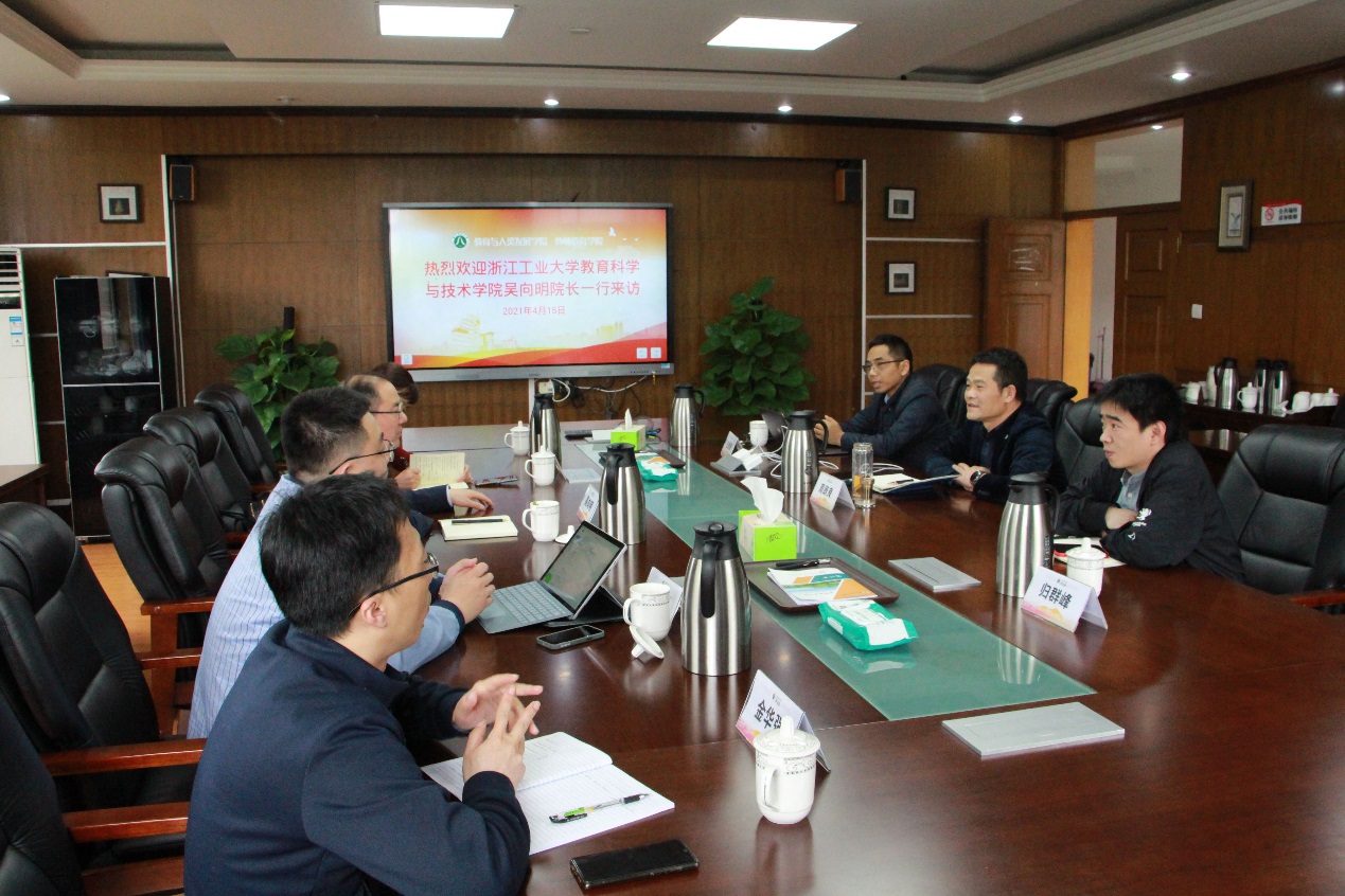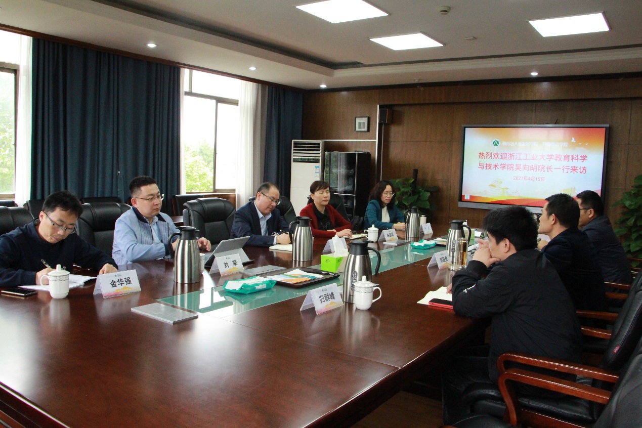 4月15日下午,浙江工业大学吴向明院长一行来金沙以诚为本官网考察交流工作,院长周跃良、院长助理王良辉、教师教育实训中心主任归群峰参加了座谈会。