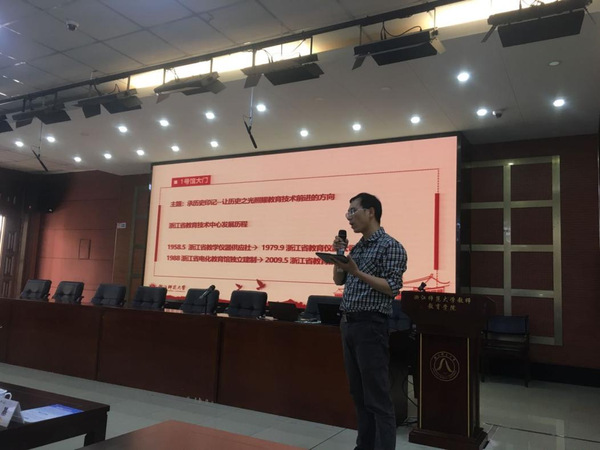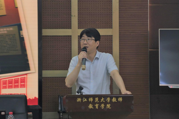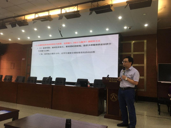 在展示环节中,课程与教学系教师唐恒钧选取《统计与概率》课程的一节内容现场展示了课程思政教学成果。他从“用统计的眼光看中国发展”案例入手,带领师生感受了自改革开放以来中国经济增长、教育进步情况,及近期新冠疫情防控成效,让师生直观、深刻地感受到了社会主义制度的优越性及党对人民生命安全的最高保障,用数据让我们的思考更加理性,观点更有力量,进一步提升师范生用数据说话的意识、习惯及能力。接着,课程与教学系教师谢群向师生展示了教师教育公共课《微格教学与诊断》的课程思政教学成果。她饱含深情地讲述了“袁隆平院士和杂交水稻培育”的科学探究过程,生动、深入地引导学生感悟科学家的勇担社会责任、理性精神以及科学探究的勇气和坚持,进而思考在具体教学如何将科学探究的“种子”播种在中小学生心中生根发芽。教育技术学系教师张家华则以“承历史印记--让历史之光照耀教育技术前进的方向”为主题汇报了课程思政视角下的教育技术学专业教育实践尤其是教育见习的教学进展。通过带领师生感知浙江省教育技术中心解放前后的发展历程,了解国家教育技术领域的发展历史,增强学生的专业认同和教师职业认知。