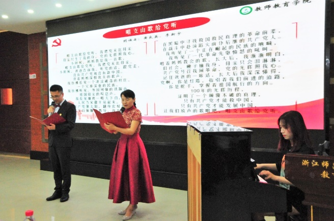 在建党百年之际,黄良英老师、李新宇老师将赞美融入诗词,为师生带来一首《唱支山歌给党听》,伴以徐跃宸同学的现场钢琴演奏,表达了“把党比母亲”的真挚情感,拉开了本次“颂诗迎百年”朗诵决赛的序幕。