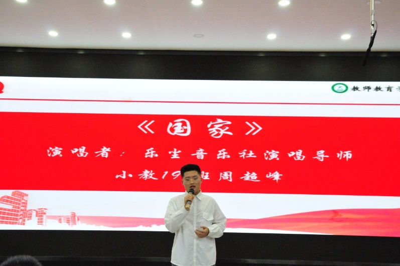 即兴朗诵环节结束后,乐尘音乐社演唱导师周超峰同学为我们带来一曲《国家》,道出了国与家的深厚情感,展现了国的强大与家的祥和,引得现场观众掌声连连。
