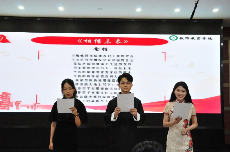 百年风雨飘摇,百年跌宕起伏,百年初心依旧,百年历久弥坚,中国共产党走过了坎坷与荆棘,品尝了屈辱与血泪,更创立了无数的伟大业绩。“忆往昔风雨兼程岁月如歌,看今朝百年华诞风华正茂”,值此佳际,5月16日晚,金沙以诚为本官网师范技能训练工程系列活动之“颂诗迎百年”朗诵决赛在17幢112报告厅顺利进行。在诵读经典诗文中,锻炼师范生基本技能,品味中华民族优秀文化,共庆中国共产党100周年华诞。本次比赛由金沙以诚为本官网工会主席、国家级普通话测试员黄良英老师,院应用心理学专业系主任李新宇老师,院团委书记兼学工办主任叶青老师,院辅导员蒋栩璐老师、蒲伟军老师担任评委。