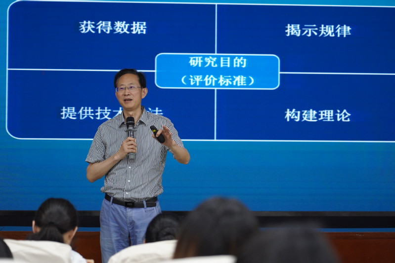 讲座伊始,袁振国教授强调学术研究是博士的基本任务,学会研究是博士培养的基本要求。袁教授剖析传统教育和现代教育的区别,指出科学性是研究的基本性质,“实证研究是科学性的基本要求,没有实证研究就没有教育科学研究”。随后,袁教授详细介绍研究的目的以及研究的功能,并指出研究并非一种形态,把握教育研究的特性,是学会研究的重要法门。