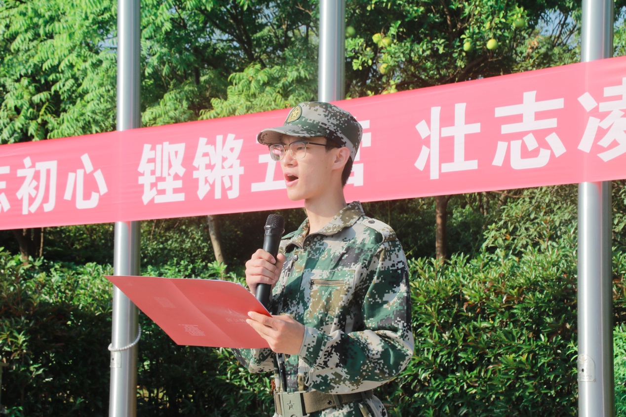 军训营员代表心理201班王浩清同学,代表2020级全体同学做出以下承诺:高标准严要求完成军训;一切行动听指挥,坚决服从军训领导与教官管理,发扬“不怕苦,不怕累“的精神,认真学习各项军事技能;团结友爱、和睦共处、相互扶持,铸就一个具有更加具有凝聚力的2020级学生队伍。