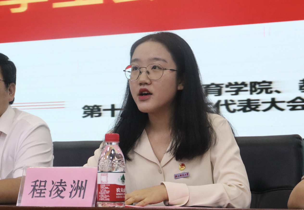 校学生会执行主席程凌洲对于教院学生会过去一年在思政教育、组织建设、品牌活动建设、学风建设、志愿服务以及文体心理等六个方面的工作给予了高度肯定。此外,她还分享了几点关于学生工作的感悟。“学生会要紧跟时代步伐,重视队伍建设”,她指出学生会要增强团队凝聚力与综合能力,时刻保持积极的工作态度,建设素质优良的学生骨干队伍。