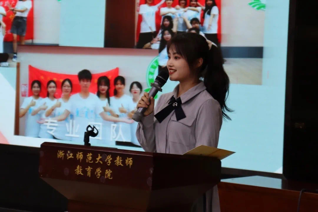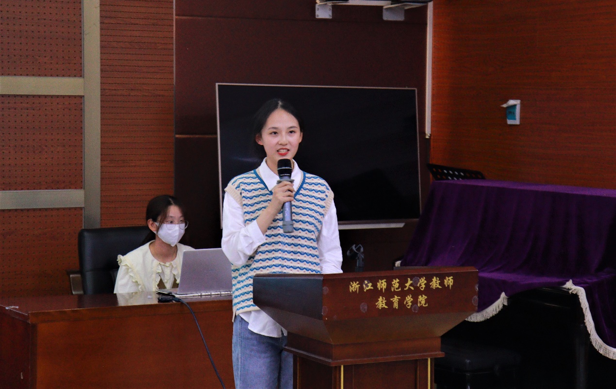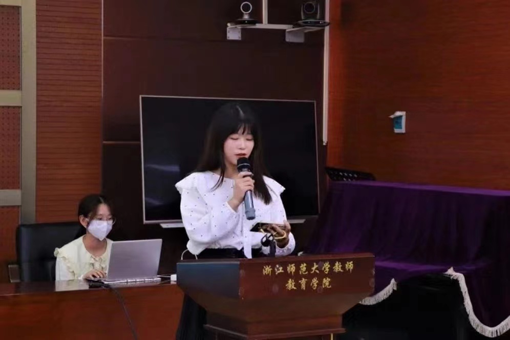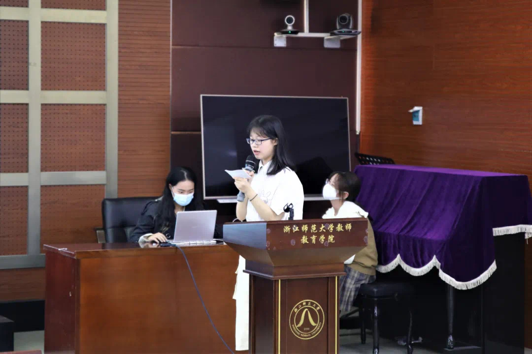 答辩伊始,来自心理202班“新征程”实践队的陶佳琳深情并茂地讲述了她的故事。通过访谈88岁铁路工人、制定与实践党史“长征路”以及制作秋瑾先生宣讲视频,她对党有了更加深刻的了解。来自小教203班“童心夏梦”实践队的刘奕君在暑期实践中参与了声乐乐理课的教学。在备课授课以及排练声乐节目等活动中,她也收获了丰富的教学经验。而来自小教202班“童心夏梦”实践队的谈方怡回忆起参与的红歌快闪,实地调研问卷发放及访谈等活动,她说道:“这次社会实践不仅锻炼了我的写稿能力,还让我在日常紧锣密鼓地执行任务过程中提高了交流沟通,合作协商等能力。”
