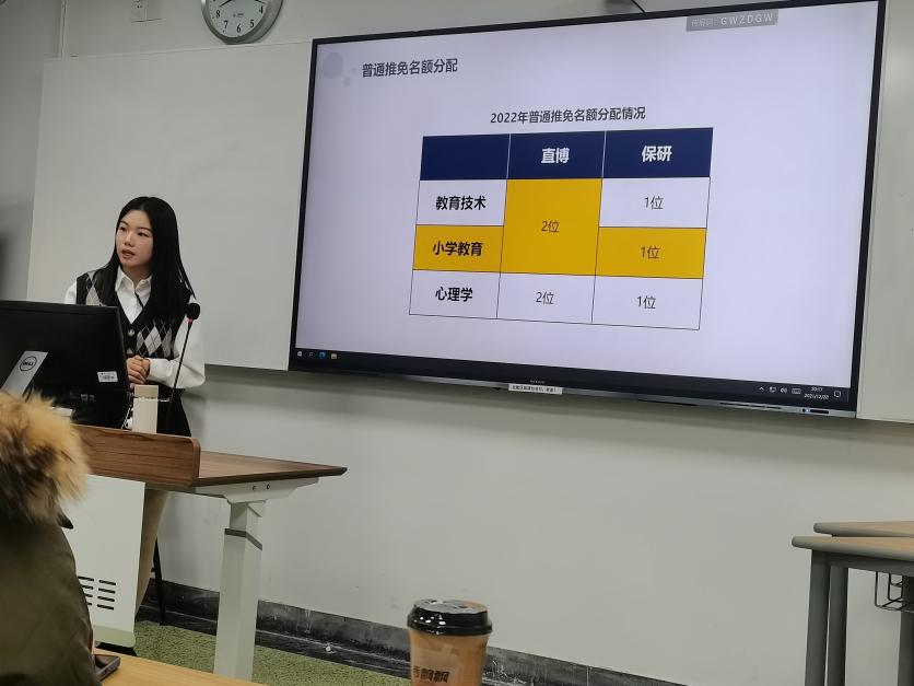随后,是目前已经直博浙师的李昕怡进行经验分享。她向同学们介绍了什么是“直博”、分别有什么学科、名额分配、推免条件等重要内容。她重点强调了有意向直博的同学需要关注自己的绩点,并努力提高自己的绩点,在争取拿到较高绩点的基础上,尝试全面发展,拿到额外加分,如学科竞赛、发表论文等;此外,李昕怡还特别指出英语水平非常关键,她也督促同学们认真学习英语,为今后的发展打下基础。