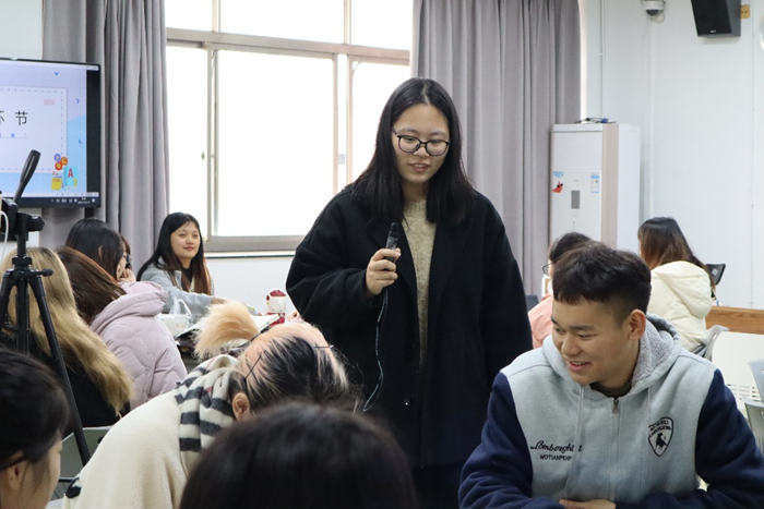 在开场导入环节,周文静和高雯雯两位心理委员请出由三位同学扮演的教育心理学大师并让他们分别开展自我介绍,以生动有趣的方式带同学们回顾了埃里克森、班杜拉、华生的相关知识,以此拉开心理班会的序幕。
