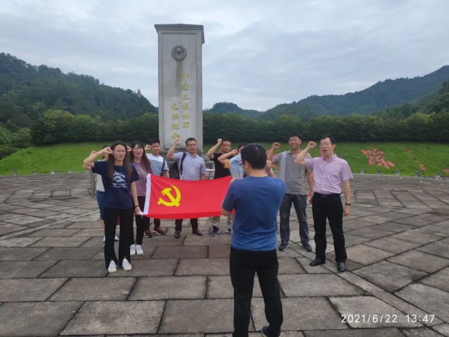 随后,在支部宣传委员刘爱生博士的带领下,全体党员在中国工农红军纪念碑旁重温入党誓词,清澈而响亮的宣誓声在山谷中回荡。
