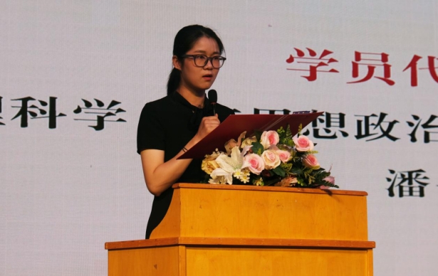 在学员代表发言环节,来自地理与环境科学学院地理科学(与思想政治复合)专业2101班的潘书畅同学结合在党员之家的经历以及自身对党的理解,表明自己对中国共产党的崇敬和迫切入党的渴望,呼吁学员们珍惜党校学习机会、刻苦学习理论知识,并代表全体新学员承诺在党校的学习过程中虚心求教、牢记责任与使命,努力成为担当起中华民族伟大复兴重任的时代新人。