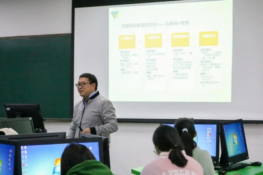 讲座伊始,王勋老师用典雅而切题的古诗词引入了课程的目录,由浅入深地带领学生们了解并设计和制作微课。首先,王勋老师用从古到今的时间轴逐步延伸到如今互联网时代下教育方式的改变,用生动的语言解释了大数据下微课的产生和发展,并结合自身经历幽默地展现大数据对于人们生活产生的深刻影响。