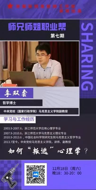 为帮助更多同学规划未来的升学、求职,2021年12月18日晚,由李新宇党员教授工作室策划出品的师兄师姐“职业帮”第七期于线上举行,本次分享会邀请到了中央党校马克思主义学院副教授,我校07届应用心理学专业毕业生——李双套校友。