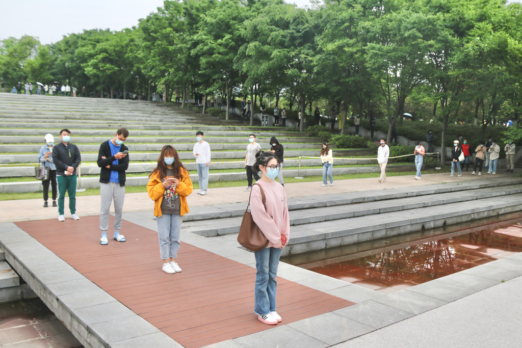 全程佩戴口罩,间隔两米,排起U形长龙