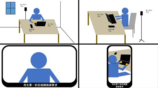 考生须提前准备好网络远程机考所需的硬件设备,按照下面图示进行摆放安装,考试前按考务人员要求配合完成测试及模拟考试,以保证考试正常进行。如有困难,及时向学院反映。如考生未进行测试,导致考试时出现问题,由此造成的一切后果考生自行承担。