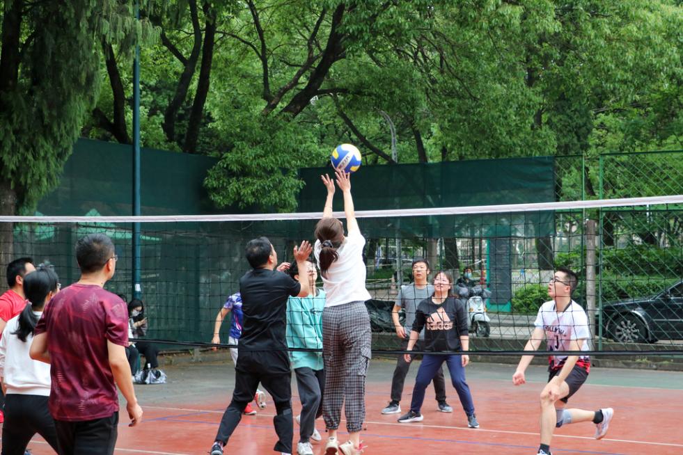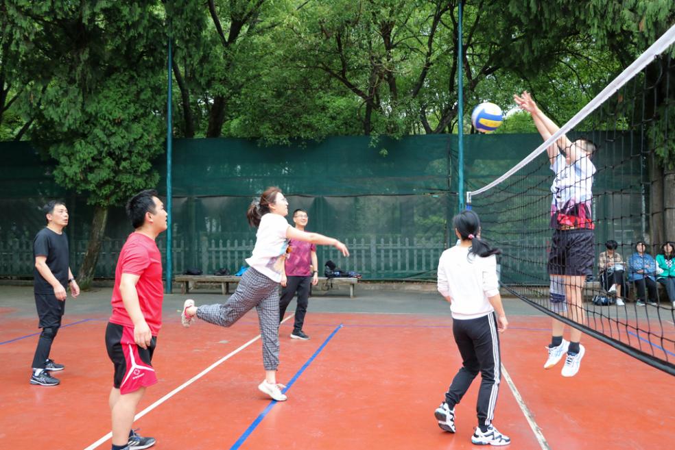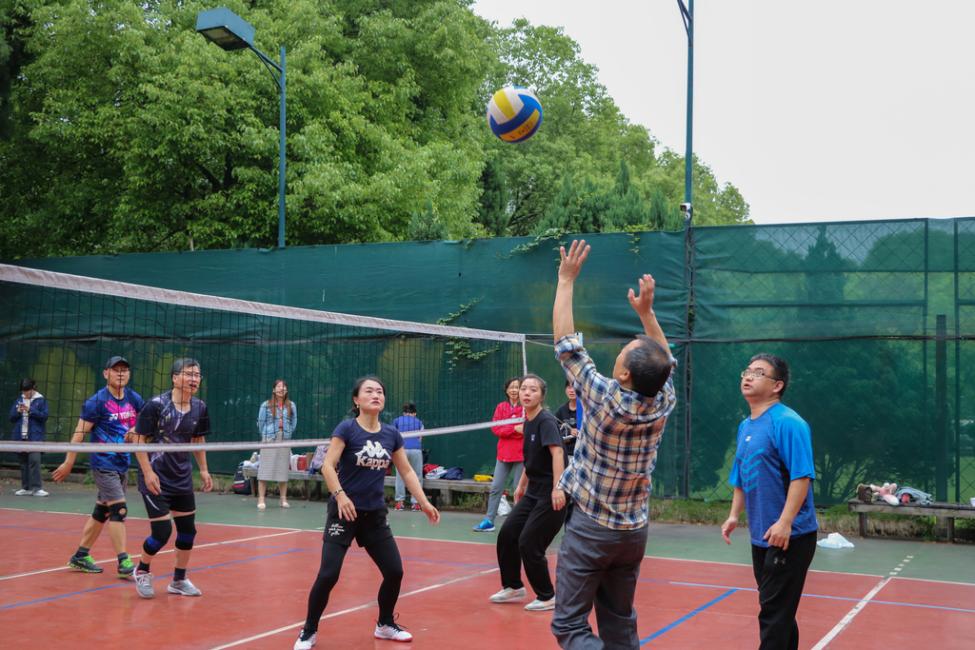下午两点不到,两个学院的教师们就早早来到了排球场上进行热身与锻炼。为他们加油打气的老师们和同学们也陆续到场,场上气氛渐渐热烈了起来。随着裁判一声哨响,比赛正式开始!