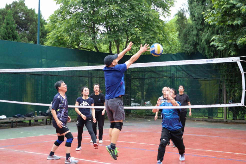 比赛采用三局两胜的规则,两个学院分别派出两队老师,在两个场地同时进行比赛。第一局比赛,大力的发球、高高跳起的拦网,一声声“我来接”、“我打”的配合以及相互之间的加油喊好,让9001jcc金沙以诚为本的老师们打出了气势,分别以21:11与21:17的比分拿下第一局。