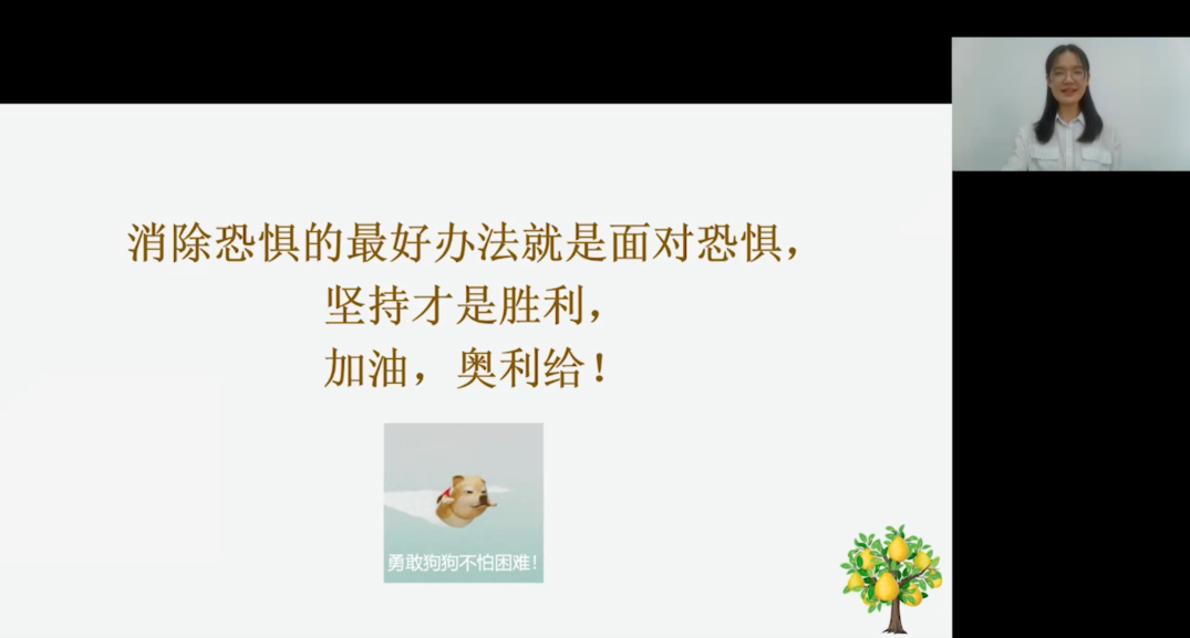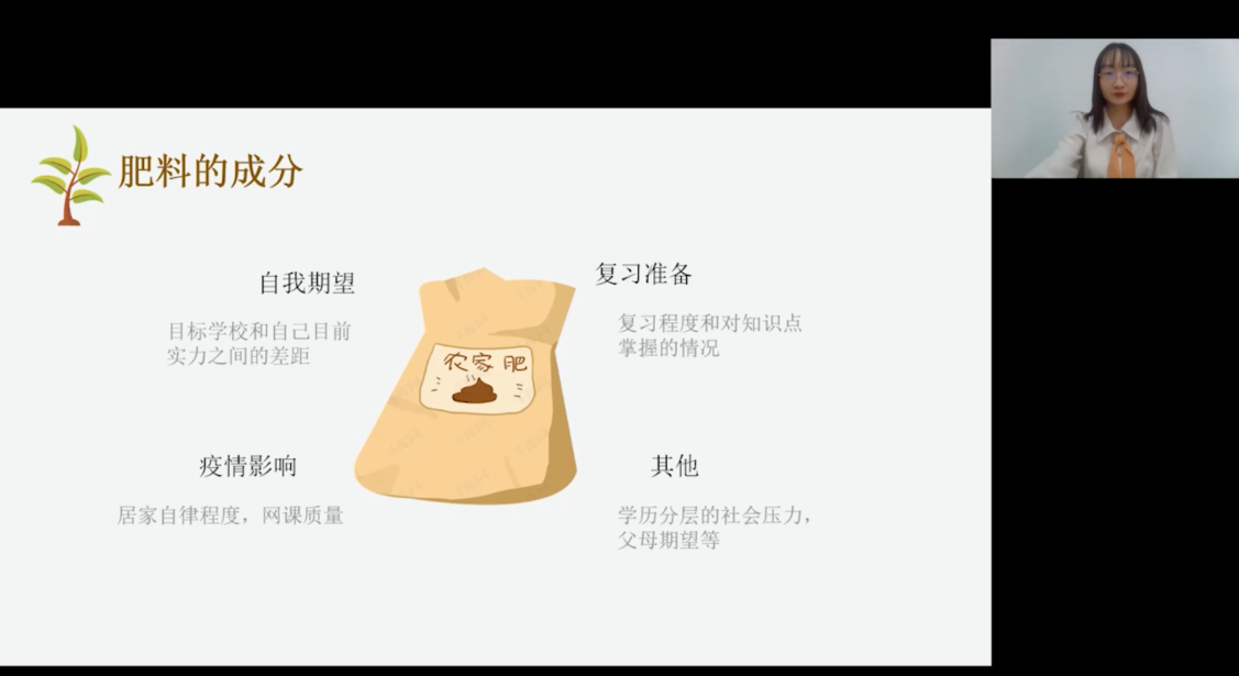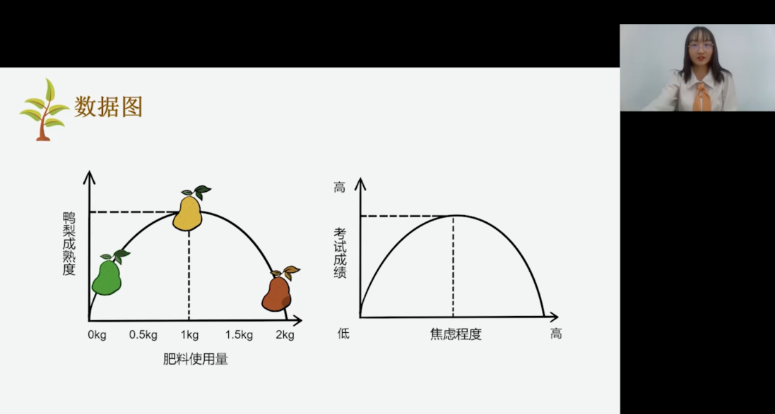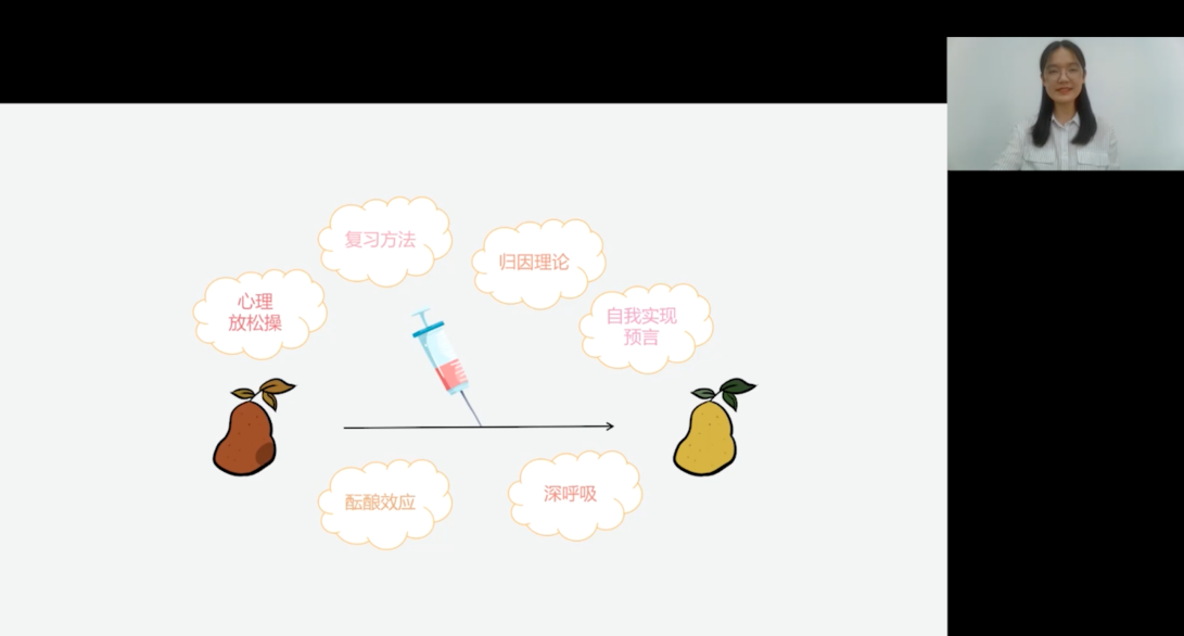 少年没有乌托邦,心向远方自明朗。讲座开始,小邓老师就将同学们带入了一个生机勃勃的果园情境。同学们作为尽职尽责果园的工人,要努力栽培出最甜的鸭梨!“鸭梨”的成分为考试压力、担忧、不安、紧张、焦虑等等,而自我期望、复习准备、疫情影响等则是种植鸭梨的“肥料”;通过一个简单的小测试,同学们可以对自己已给鸭梨施加的肥料做出简单的量化。讲座视频结合一张清晰明了的数据图,强调了只有适当的肥料才能栽培出最甜的鸭梨,过多过少都会使得效果不如我们预期的那样;再将鸭梨的肥料及成熟度同等转换为同学们的焦虑程度和考试成绩的关系,直观清晰。最后,通过两个小游戏,小邓老师告诉同学们:保持良好稳定的心态,会更有利于考试成绩的提高。