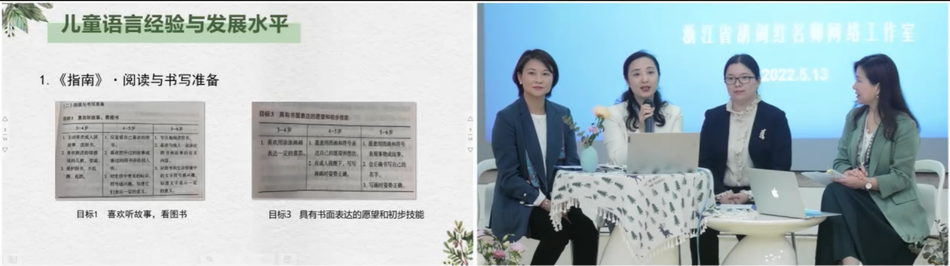 胡剑红名师网络工作室团队则聚集幼儿园语言教育的现状与发展态势进行团队展示。特级教师以《基于发展视角的幼儿园语言教育变革与实践》为主题作了观点报告,之后团队由胡剑红做主持人,组织成员王蓉、章丽、李玲协同开展幼儿园语言教育变革圆桌论坛,围绕集体活动、区域游戏的设计与实施介绍了语言教育融合的思路,并对师幼互动中的语言支持进行了经验分享。