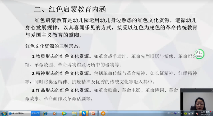 彭小元名师网络工作室团队进行了《幼儿园红色启蒙教育规划与实施》的系列展示,由特级教师彭小元做观点报告,从红色文化融入幼儿园教育存在的问题出发,阐述了红色场域学习实施流程、红色项目学习实施流程、红色榜样学习实施流程、红色博物馆实施流程。陈连连、郁晓洁、许欢、汪莉娜等工作室成员分别分享了上述四个模块的实践探究经验。
