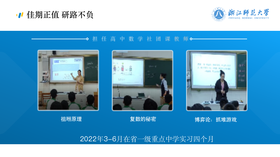 “作为一名学生党员,我深刻地意识到了教师在教育现代化进程中起到的重要作用。”在这个学期,刘佳阳进入了一所中学实习。祖暅原理、复数的秘密、抓堆游戏……在社团课中,除了教授数学最基础、重要、深刻的一面以外,她还与学生分享了数学实用、有趣、美丽又浪漫的一面,尝试带领他们去了解知识产生的背景及其迷人的发展过程。如今,研二的她也坚定了自己的教育信念,渴盼能够在成为一名“研究型教师”的道路上砥砺前行。
