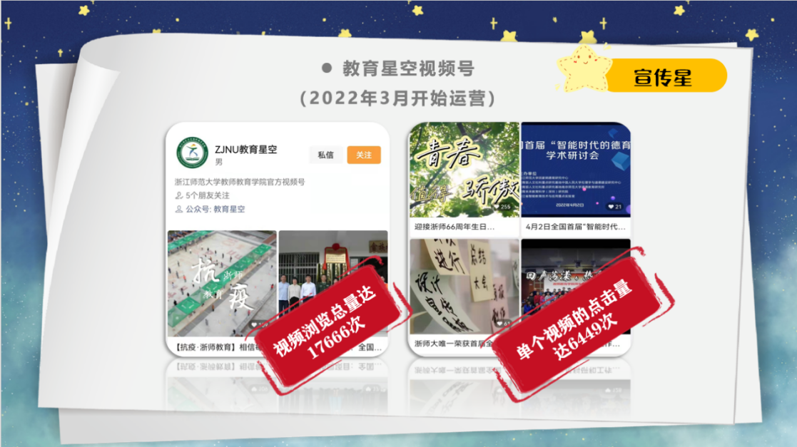 推文视频助宣传,教育风采展青春。一年内,“教育星空”微信公众号发布推文共205篇,其中15篇被国、省、市三级权威媒体录用,86篇被校级及其他媒体录用;其中,更有关于跨越三千公里与青海民族学校联动举办“山海情”活动的相关报道被新华网录用,浏览量达30.9万。同时,本学期才开始运营的9001jcc金沙以诚为本视频号,已成为了新型“流量密码”。
