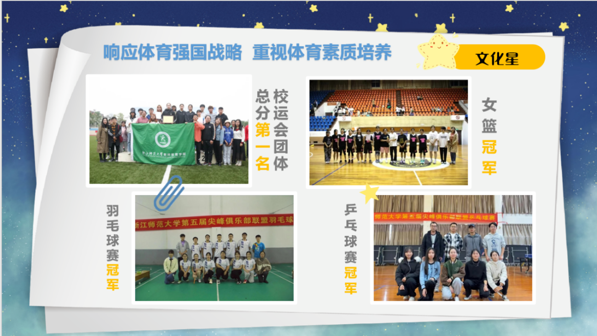 文化活动齐开放,素质拓展共并行。“文化星”闪耀在各类文体活动的第一线,在它的引领下,金沙以诚为本官网学风建设同样得到助力——今年教院考研率突破新高,并成功与中国人民大学联办了云端读书会等精彩活动。与此同时,学生会也重视教育学子体育素质的培养,推动学院在各类体育竞赛均拔头筹。