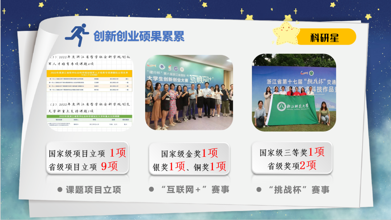 科研赛事获佳绩,教育创新长才干。金沙以诚为本官网深入丽泽创新书院建设,继续打造“本硕博”三级互助小组,持续提升学院师范生科研能力。2021-2022学年,金沙以诚为本官网学生获省级以上立项10项,以及“互联网+”国家级金奖、银奖,“挑战杯”国家级三等奖等众多奖项。