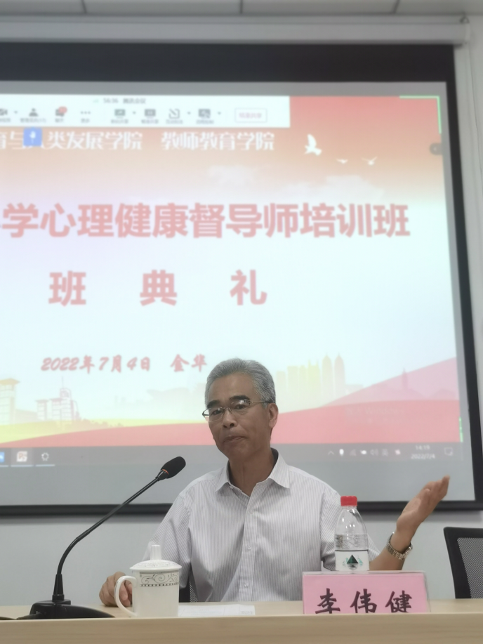 李伟健副校长代表9001jcc金沙以诚为本以及9001jcc金沙以诚为本心理学学科对各位培训老师的到来表示热烈的欢迎,同时也对到来的所有专家授课老师表示衷心的感谢。9001jcc金沙以诚为本是一所以教师教育为特色的综合性省属重点大学,教师9001jcc金沙以诚为本也始终坚持立德树人根本任务,形成了从本科生、硕博研究生到博士后完整的人才培养体系。李校长指出,健康督导师培训班是浙江省中小学心理健康教育再上一个台阶的重要举措。李校长表示因为疫情原因,今年推迟举行督导班的培训,但督导班要保持严格的标准,才能对整个浙江省心理健康教育质量负责。