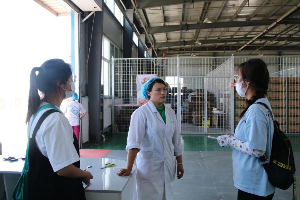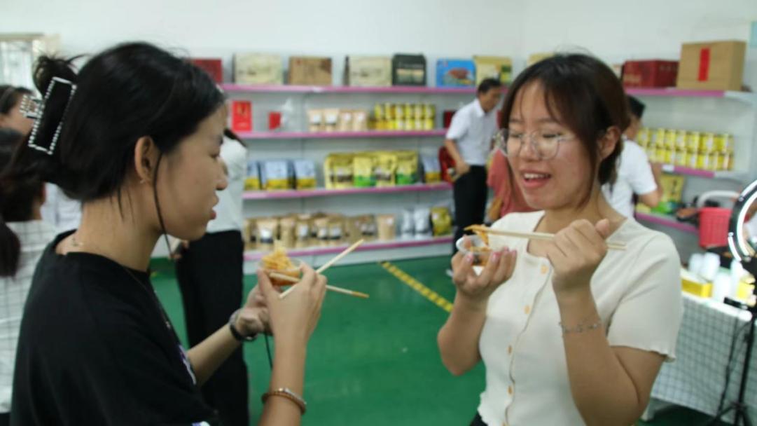 随后,实践队又参观了禾美电商车间。首先,车间负责人向她们介绍了禾美电商车间的主要情况:车间是由闽宁镇政府倾力打造的集生产、加工、销售、品牌培育、就业服务、技能培训于一体的电商示范基地。通过闽宁对口协作,车间搭在了移民的家门口,村里的留守妇女在家门口变成了产业工人,有了稳定的收入。实践队员们还在带货车间品尝了用火锅底料煮制的美食,味道十分美味。