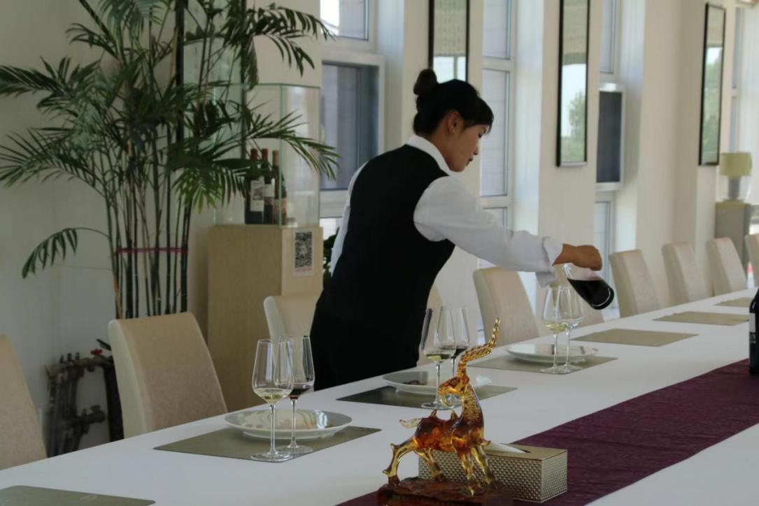 在立兰酒庄,她们跟随负责人小李的步伐,一路参观了酒庄的酿造工厂、葡萄种植园,还在会客厅被热情招待品尝了葡萄酒。实践队了解到,当地的酒庄有两个品牌:览翠和贺兰石。立兰酒庄现有1600亩有机葡萄园,酒庄的长期工作人员大多都是当地人;此外,在当地用工量大的情况下也会临时雇佣原隆村村民。由于原隆村当地居民大多为老年人、儿童和妇女,因此临时招募的工人大多也是妇女,这样有利于妇女们在兼顾家庭的同时赚取生活费用。