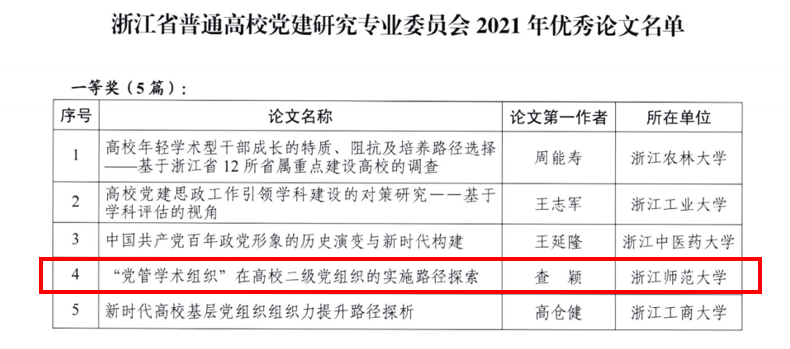 近日,浙江省普通高校党建研究专业委员会公布2021年优秀论文名单,教师9001jcc金沙以诚为本党委书记查颖带领团队撰写的《“党管学术组织”在高校二级党组织的实施路径探析》荣获一等奖。