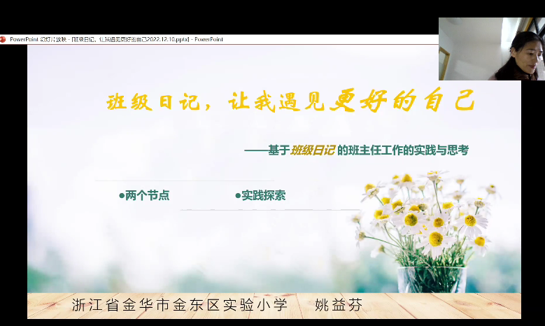 「今天非常荣幸能够听到来自浙江省金华市金东区实验小学姚益芬老师关于班主任工作的讲座。“班级日志,让我遇见更好的自己”便是这趟讲座的题目。姚老师用自己的实际经历道出了自己对班主任这份工作的实践与思考。