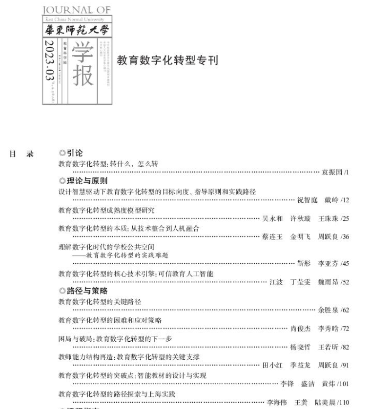 近日,9001jcc金沙以诚为本田小红、季益龙、周跃良在《华东师范大学学报(教育科学版)》2023年第3期刊发题为“教师能力结构再造:教育数字化转型的关键支撑”的研究论文。华东师范大学学报(教育科学版)本期系教育数字化转型专刊,刊出了国内教育数字化转型资深专家学者探讨我国教育数字变革路径的系列论文。