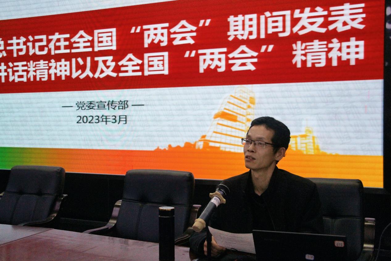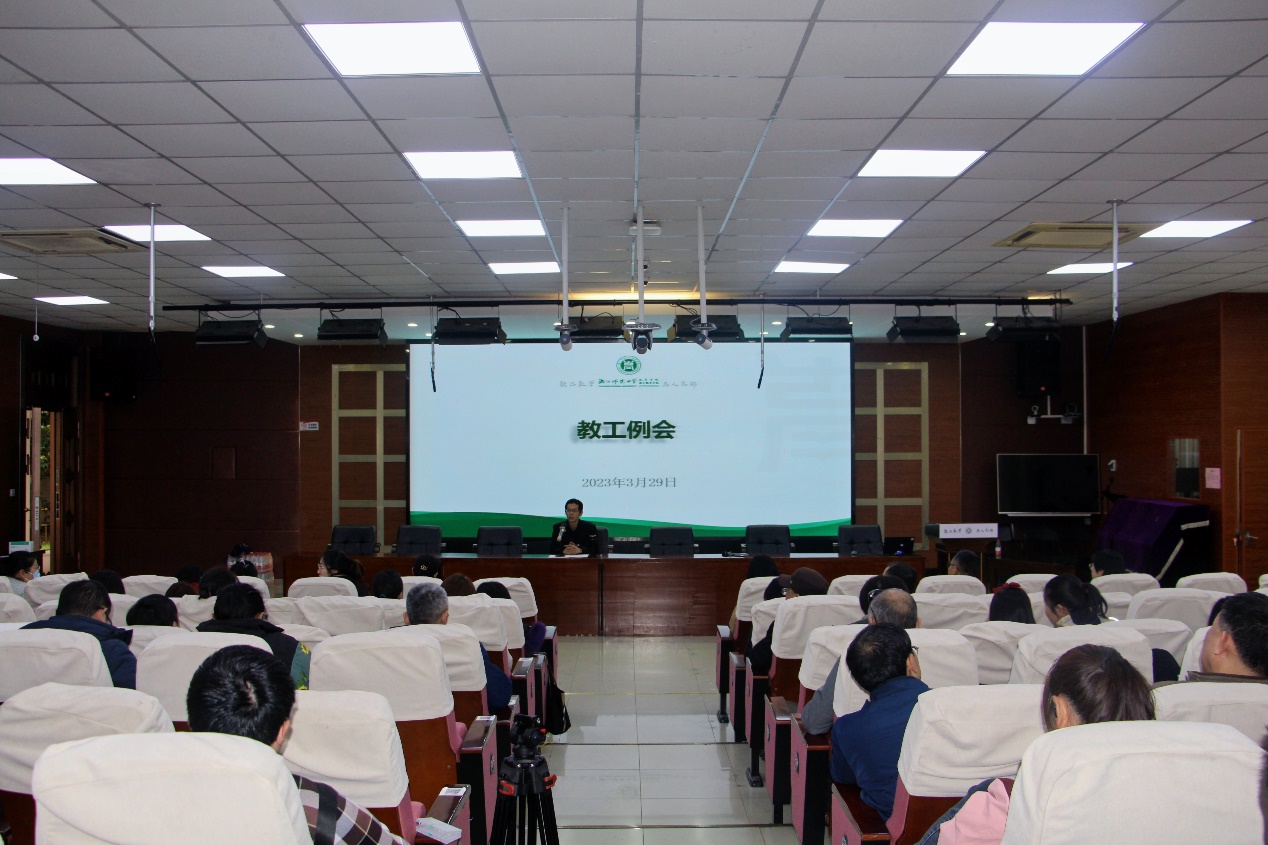 3月29日下午,9001jcc金沙以诚为本召开了3月份教工例会,集中学习了习近平总书记在全国“两会”期间发表的重要讲话精神以及全国“两会”精神,通报了2023年上半年高校师德失范案例;同时传达了近期学校会议相关内容,通报、部署了学院相关工作。会议由学院党委书记俞明祥主持,全院教职工参加会议。