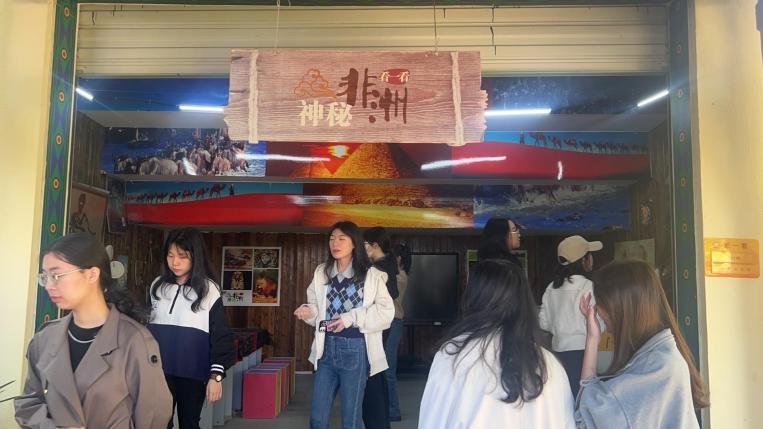 上午八点半,见习生们在校领导的带领下参观了校园。他们走过活力非洲园中异域风情浓厚的长廊,参观和体验了七个极富特色的活动小屋——“神秘非洲看一看”“鼓乐非洲敲一敲”“视觉非洲画一画”“指尖非洲剪一剪”“多彩非洲穿一穿”“友谊非洲写一写”“气质非洲编一编”,切实感受了秋滨小学以非洲园为特色,以非洲文化为校本课程核心,以促进中非团结友好为目的校园特色文化。