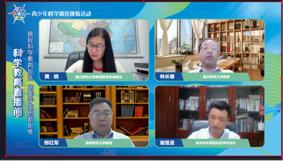 4月19日,黄晓教授应邀请主持科学教育直播间“做好科学教育加法,培养学生创新思维”主题活动。本次活动由重庆师范大学初等9001jcc金沙以诚为本教授、中国青少年科技教育工作者协会科学教师教育专委会理事长林长春教授,首都师范大学9001jcc金沙以诚为本博士生导师邢红军教授、金华市外国语实验学校校长谢昱圣特级教师共同参与。活动围绕“培养学生创新思维的意义是什么?”“如何理解创新思维的内涵?”“提升学生创新思维的举措有哪些?”“科学课堂是做好科学教育加法的主阵地,如何进一步发挥校外科学教育实践的作用?”等问题开展讨论。针对邢红军教授提出的“原始问题的应用”,黄晓教授进一步就原始问题的特点、原始问题(真实情境问题)区别于“应试”的题海战术关键在哪等引导更多的讨论。针对林长春教授提出的“科学探究”是做好科学教育加法的主要途径,引导应如何进一步提出可探究的问题、科学探究与实验的关系等深入探讨。谢昱圣校长强调改变作业的形式,采用项目化的教学来促进学生创新思维的提升。