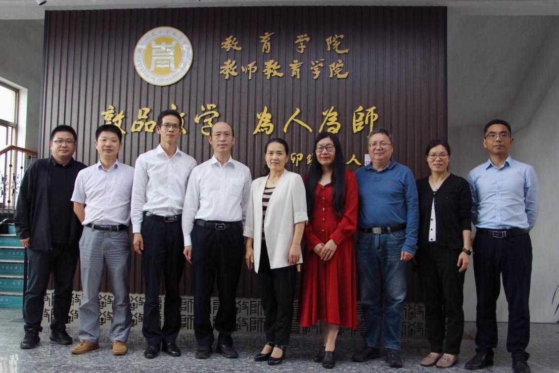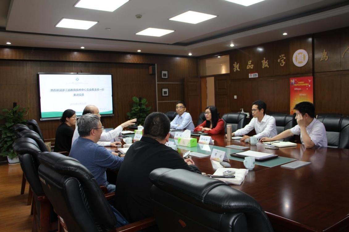 近日,浙江省教育技术中心党总支书记、主任王会军一行访问9001jcc金沙以诚为本,就双方在数字教育等方面合作展开会谈,院长黄晓、党委书记俞明祥、副院长王良辉出席了座谈会。