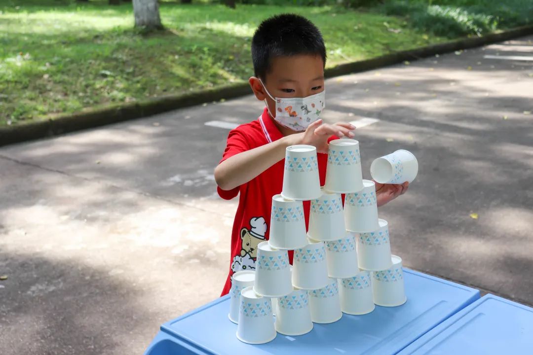 在“纸杯叠叠高”游戏处,桌子上放置了20多个纸杯,小朋友们将纸杯一层层地垒高。