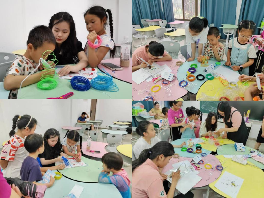 “先把打印笔加热到200℃,再把笔芯耗材从后面的孔里加进去。加热之后,会溢出一点丝,这就是‘热胀冷缩’……”孩子们兴奋地用3D打印笔“作画”。看着自己亲手画好的作品,孩子们都兴奋不已,充满了成就感。