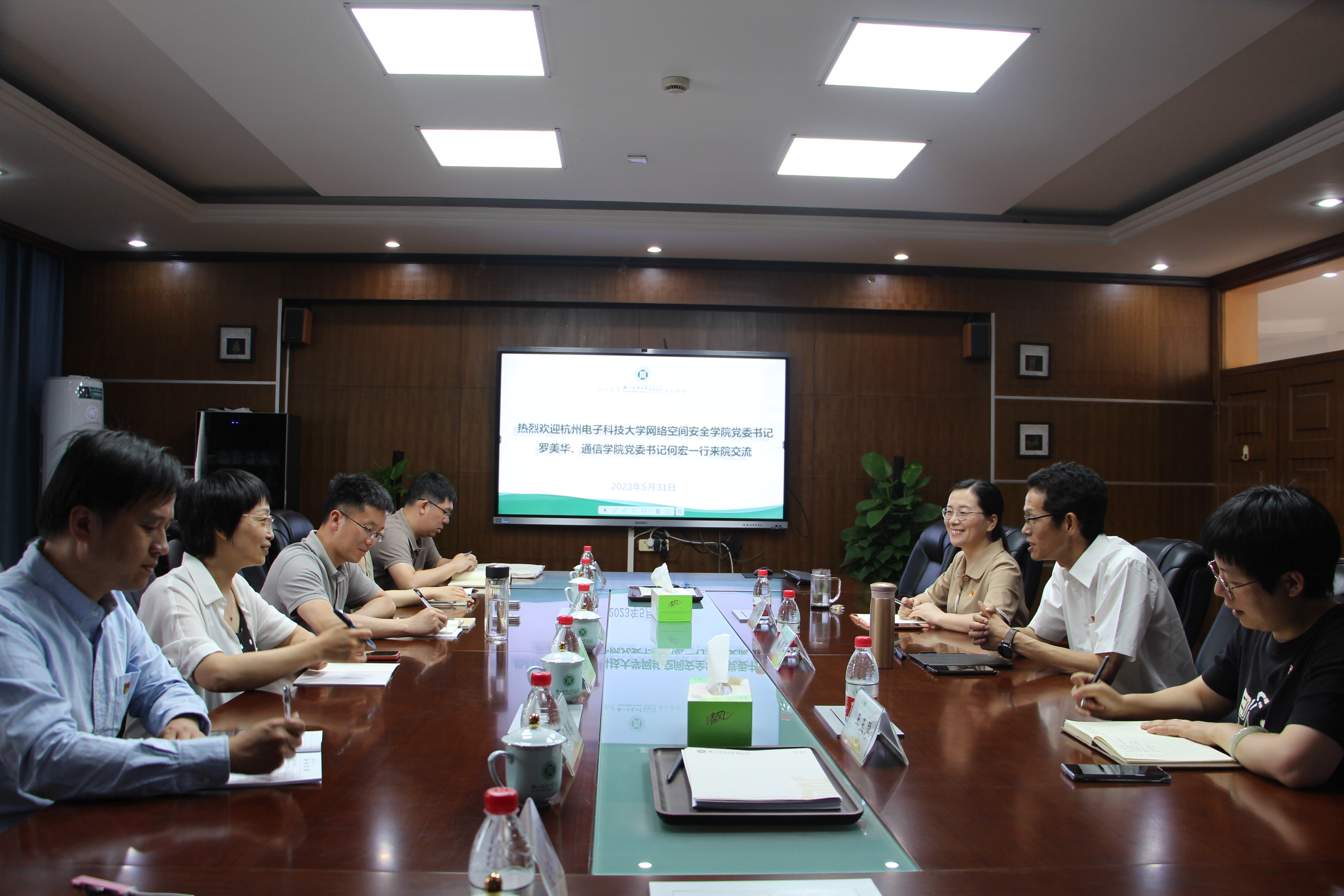 5月31日上午,杭州电子科技大学网络空间安全学院党委书记罗美华、通信工程学院党委书记何宏一行6人来金沙以诚为本官网就双方党建工作、主题教育开展情况进行交流。