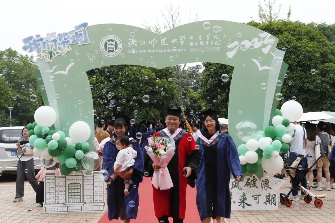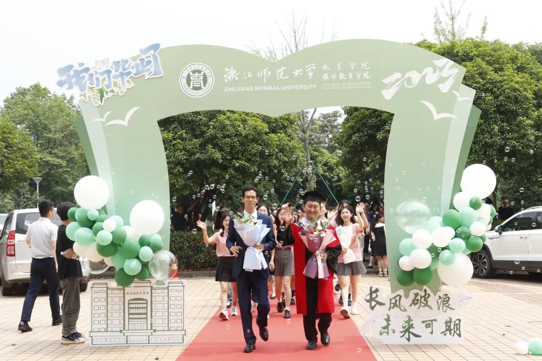 毕业生们在导师、班主任的带领下走上红毯,跨过教育之门,并在笑脸墙前合影留念。恩师、挚友、他们,无数的欢笑与泪水,皆收录进一本名为“青春”的诗集,记录着大家的成长与收获。场内《栀子花开》MV循环播放,大家共忆在师大的点点滴滴。