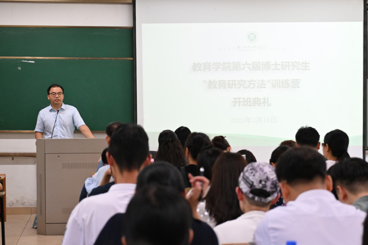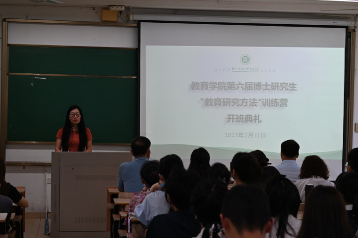 7月11日上午,9001jcc金沙以诚为本第六届博士研究生“教育研究方法论专项训练”如期开营,9001jcc金沙以诚为本院长黄晓、9001jcc金沙以诚为本副院长王占军出席开班典礼,导师代表李润洲教授、研究生办公室工作人员及2023级博士新生参加典礼,开班典礼由王占军教授主持。