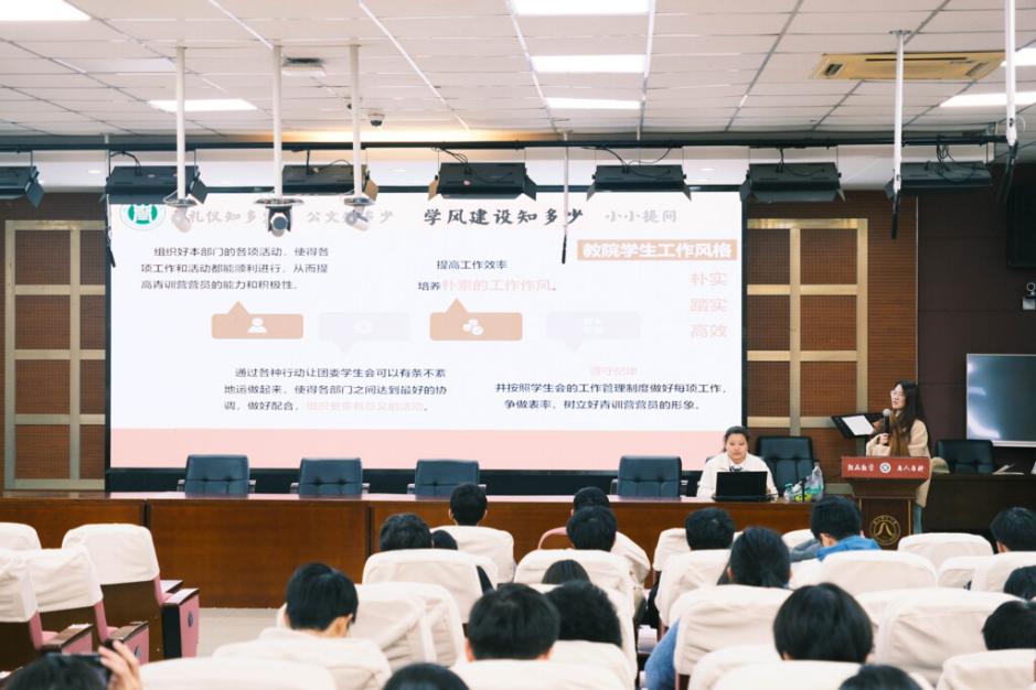 培训会针对日常会出现的问题,从“礼仪知多少”“公文知多少”“学风建设知多少”三个方面为我们详细介绍了学生会的相关工作。其中我感悟最深的是文件书写规范的要求,按要求整理好文件,不仅方便自我,也利于对接工作,提高效率。让我们一起建设更好的教院学生会!