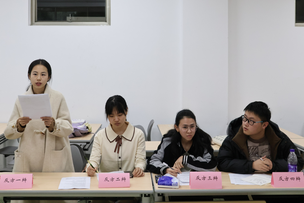 第二场辩论赛的成员是来自教育技术专业232班的正方代表队和来自小学教育专业231班的反方代表队。正反双方围绕“强调情绪价值对亲密关系是利大于弊/弊大于利”这一话题展开了紧张的辩论。正方代表队用生动的情境论证观点,解释了强调情绪价值能更好处理亲密关系中的矛盾;而反方代表队则守住己方论点,对正方发言进行了敏锐的攻防。双方你来我往、妙语连珠。最终,本场比赛由反方代表队取得胜利。