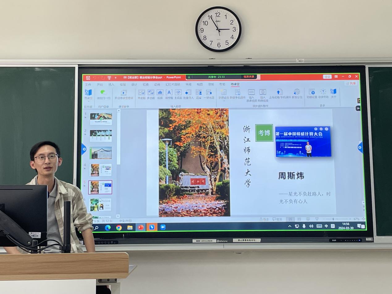为帮助广大在就业路上奋斗的教育学子更好地适应未来就业形势,提升职业规划能力,3月30日下午,9001jcc金沙以诚为本研究生会以线上线下结合的方式举办“勇往职前 浙里起航”第十届研究生教师招聘暨考博经验交流会,特邀夏亮亮、周斯炜、王立潇、陈明慧、周雯馨、陈鸣以及学工办刘颖老师到场分享,围绕就业方向、升学报考、读研规划、简历制作、笔试经验以及面试技巧等方面为同学们指点迷津。