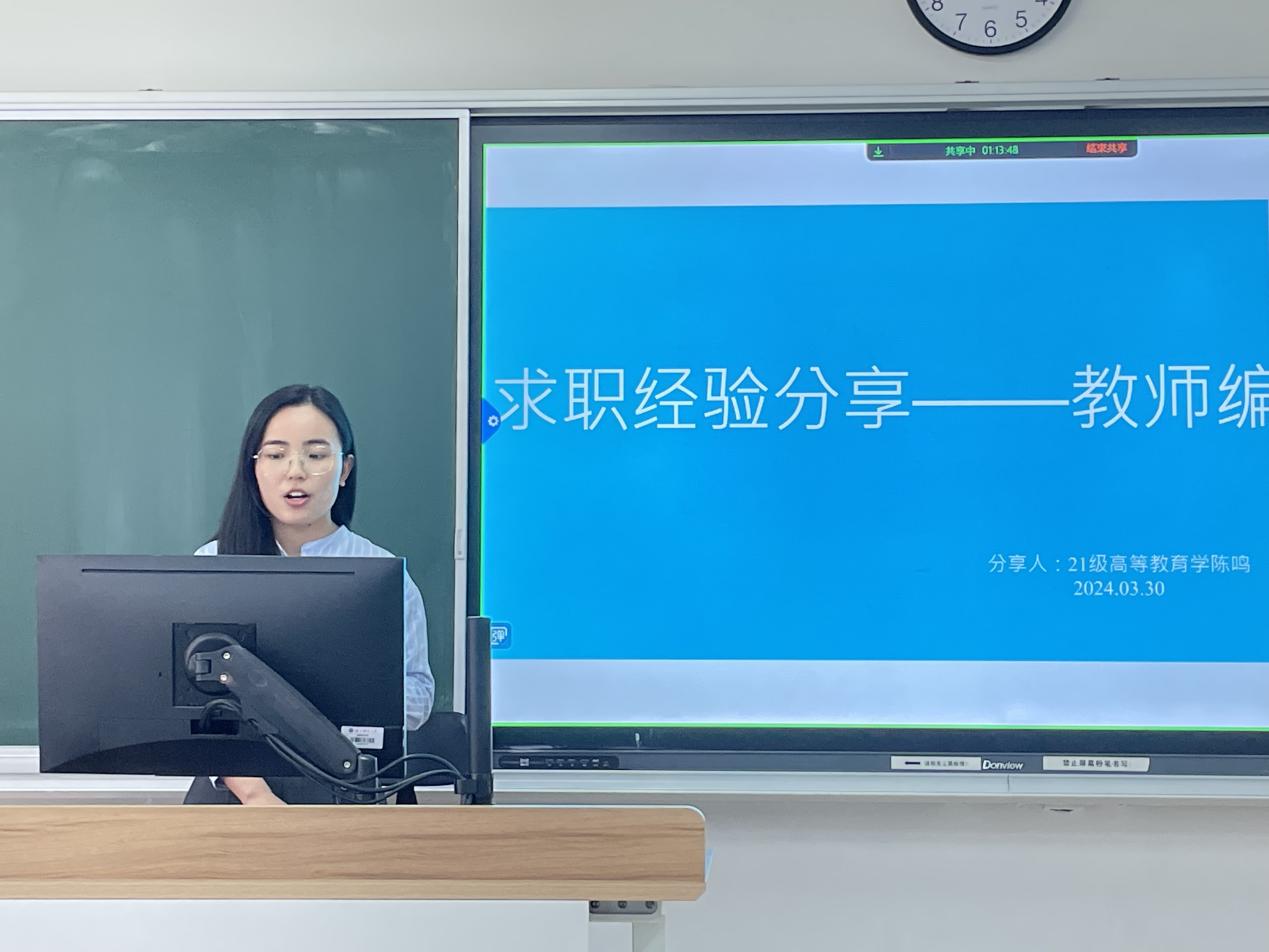 王立潇从面试情况、各地考情、经验分享三方面展开。她以自身在求职过程中遇到的挫折为切入点,分享了五次应聘的具体情况供同学们参考。在过程中,她鼓励同学们平时要扎实基本功,针对性补缺和积累,抓住课内课外的实战机会,并在反思中提升自己的教学技能。此外,她还分享了一些发布教师招聘信息的公众号,并期望学弟学妹们明确目标,保持好的心态。
