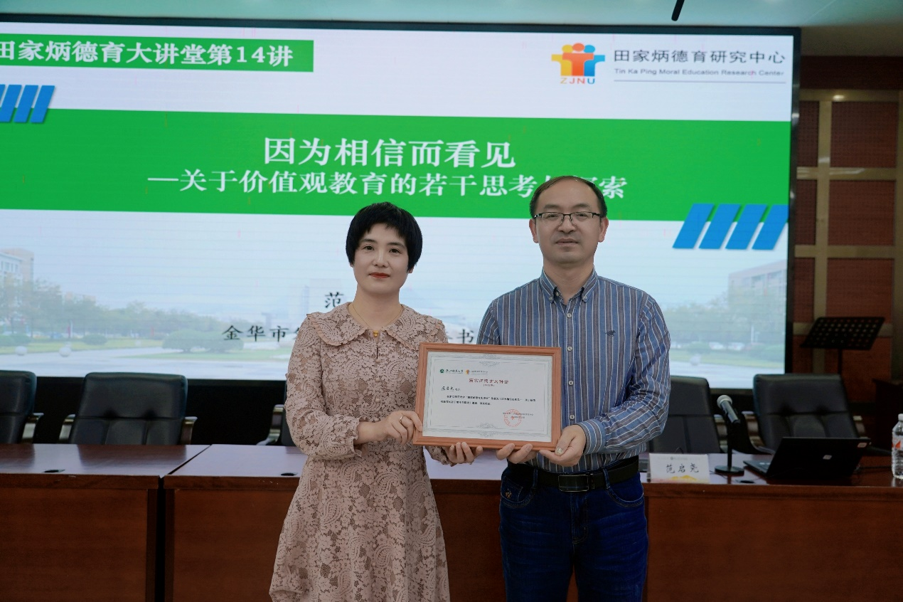 2024年4月25日下午,“田家炳德育大讲堂”第十四讲在9001jcc金沙以诚为本17幢112报告厅举行。金华市外国语学校党委书记、全国特色教育(德育)先进工作者范启尧作了题为“因为相信而看见——关于价值观教育的若干思考与探索”的讲座,讲座由中心刘小柳博士主持,中心常务副主任查颖教授、儿童道德发展研究所所长李庆功教授以及百余位在校师生聆听了本次讲座。