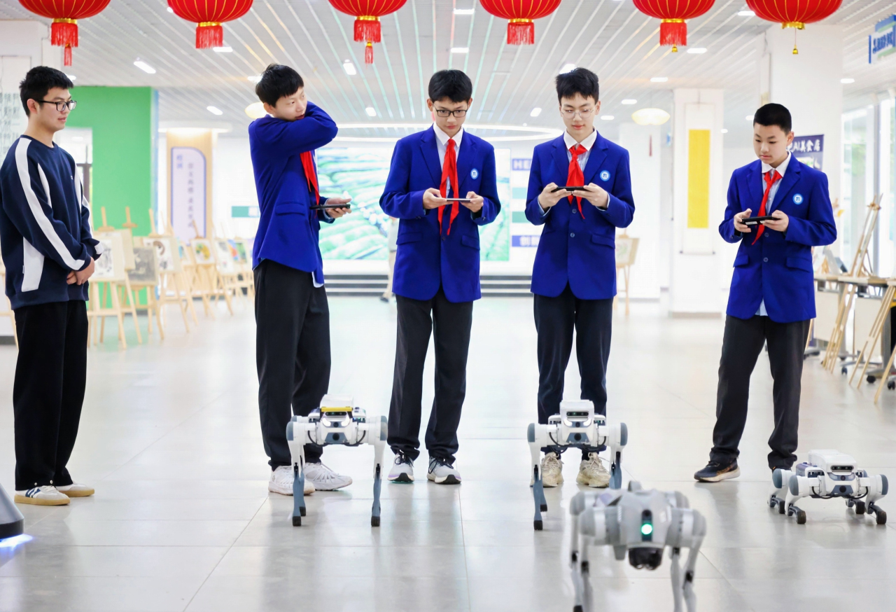 智能时代的课堂中、校园里的学生表现是怎样的?论坛期间展示了“科学狂想秀”,学生们分别与机器人、机器狗开展互动、对话,感受着科技给生活带来的创新体验。